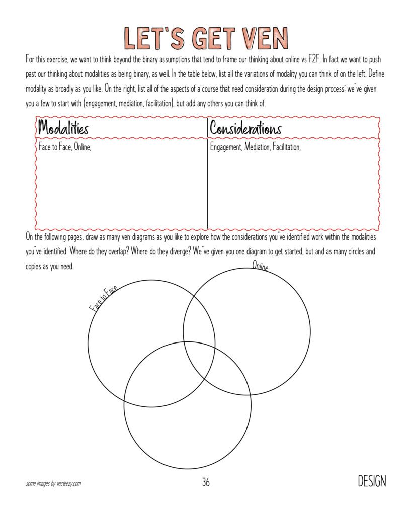 In this activity, you will diagram how different pedagogical considerations are reflected in different modalities. Use the ven diagram construct to visualize where these considerations differ and where they overlap.