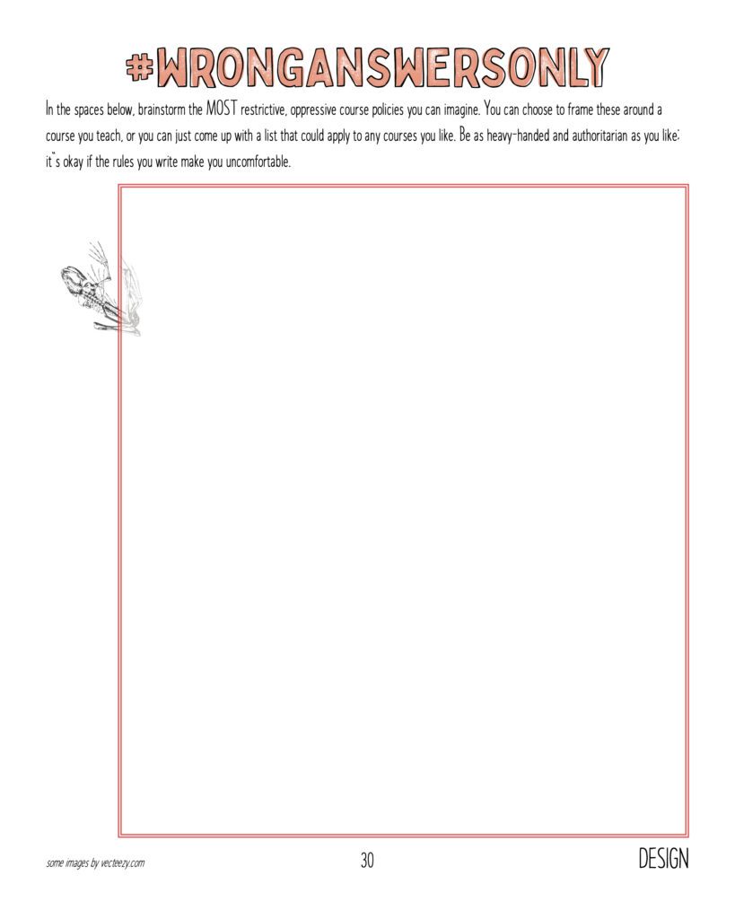 This activity invites you to start by thinking of an extreme: the most restrictive, authoritarian course policies you can imagine. Then, we invite you to rethink and rewrite those policies.