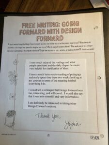 This page is your personal workspace in Design Forward. Whenever you complete an activity in a module, it will be posted here. In addition, you can add portfolio items at any time. At the bottom of the page, you will see a gray bar with options to add images, files, videos, text reflections, or workbook pages.
