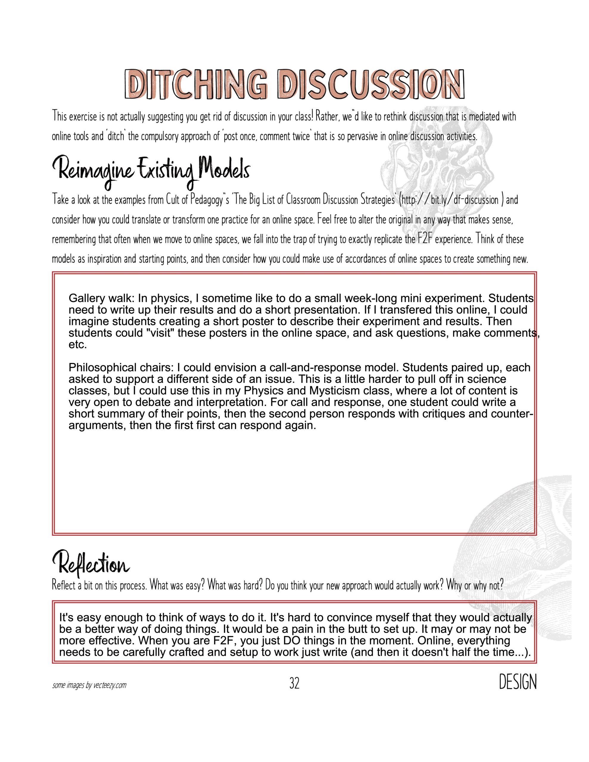Let’s rethink our relationship with discussion and participation in the classroom. Take some time to reflect on your current expectations and how those might shift in an online modality.