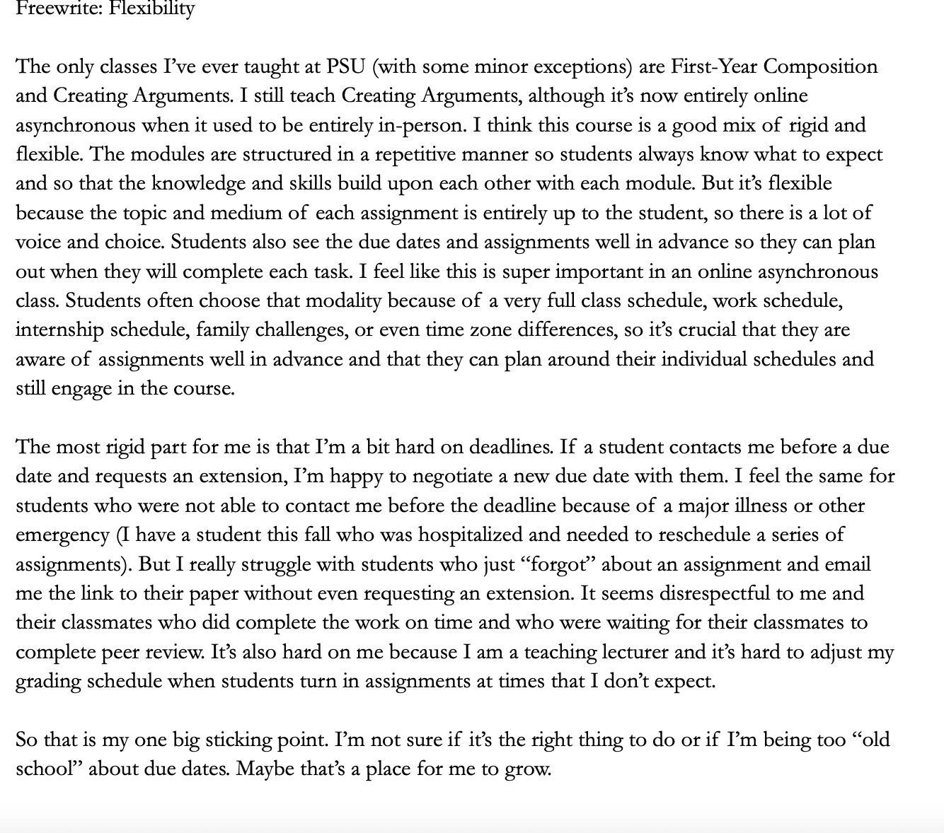 Take some time to write about how to achieve flexibility in a course you teach, while still keeping the experience coherent.