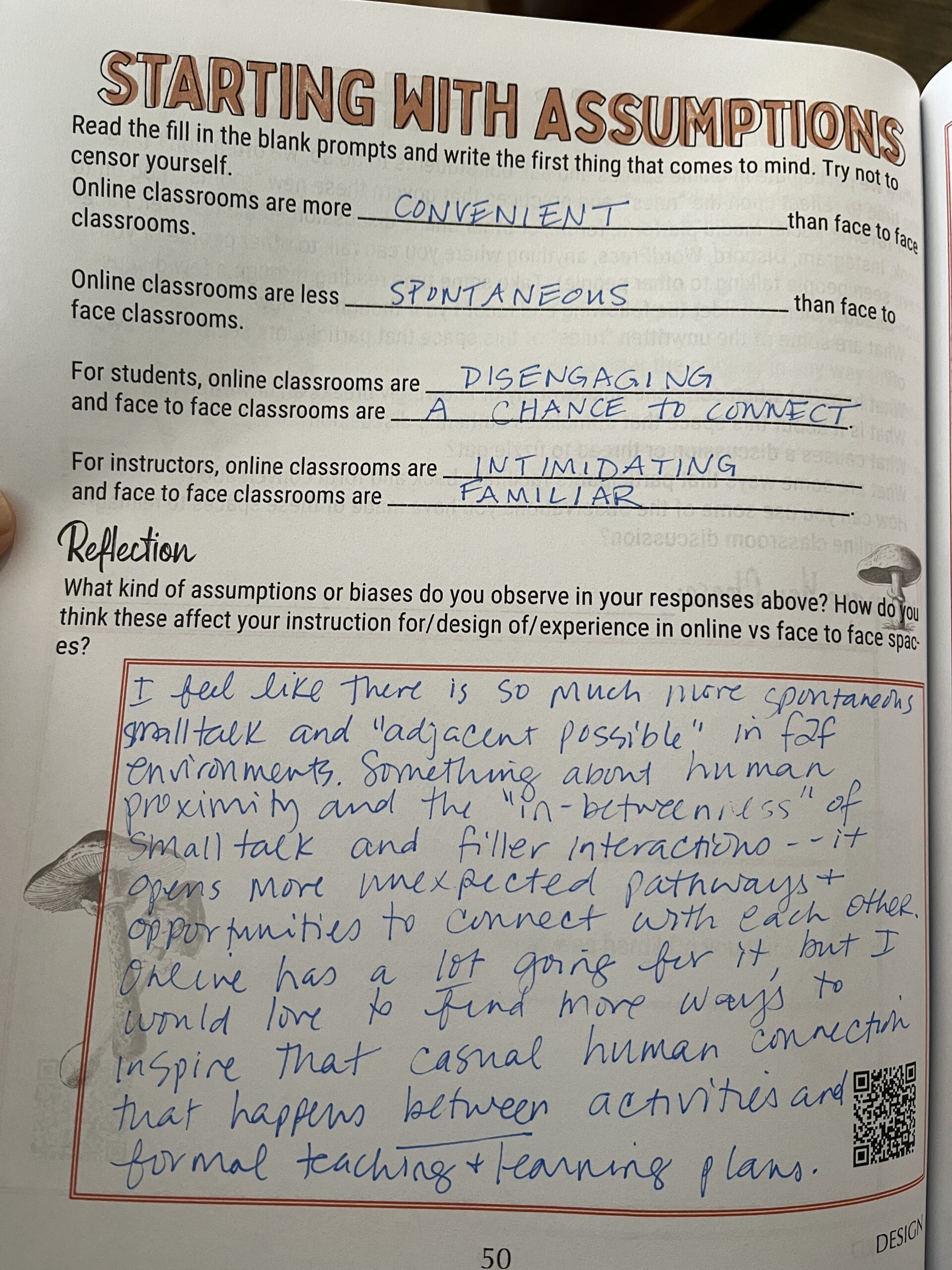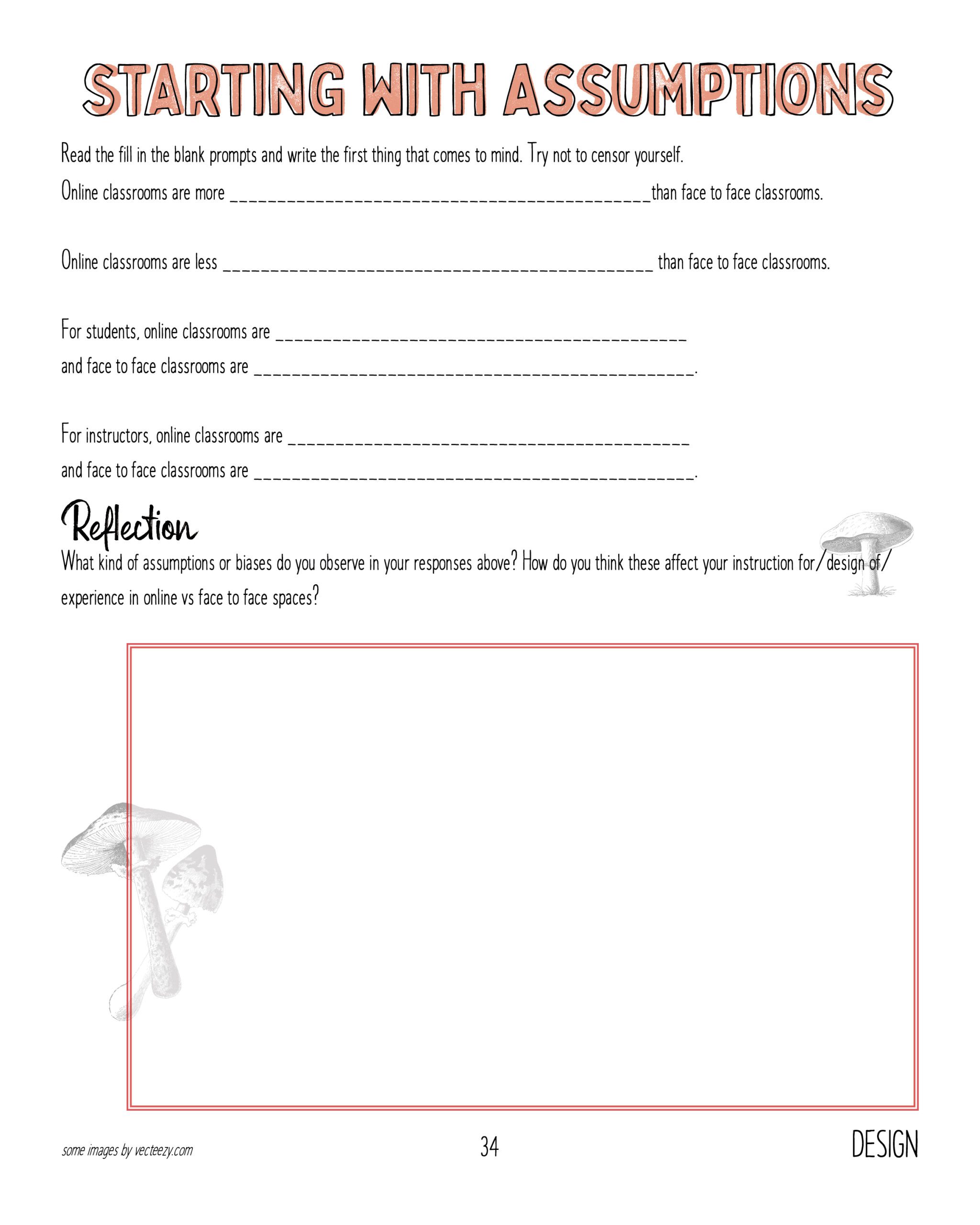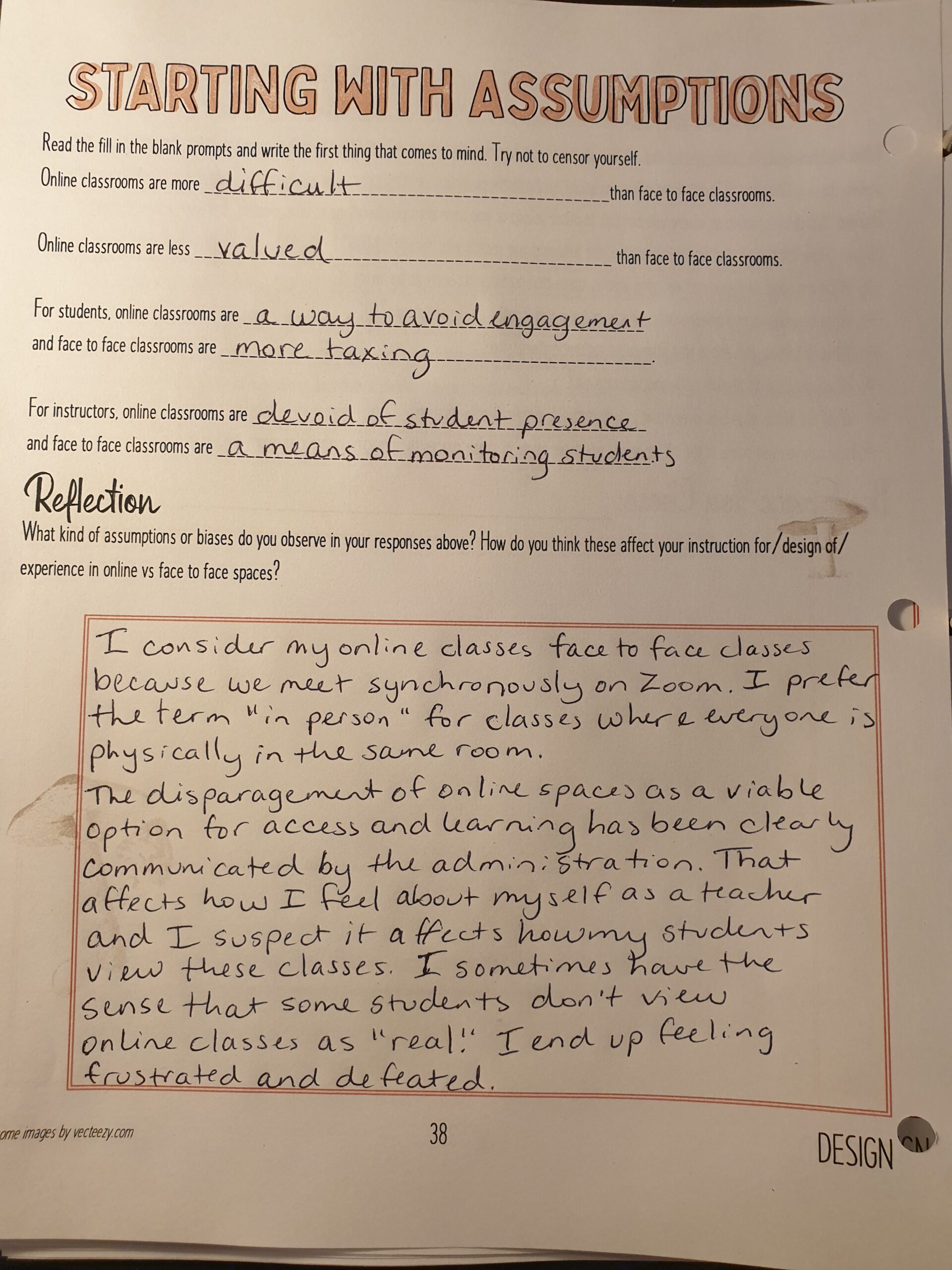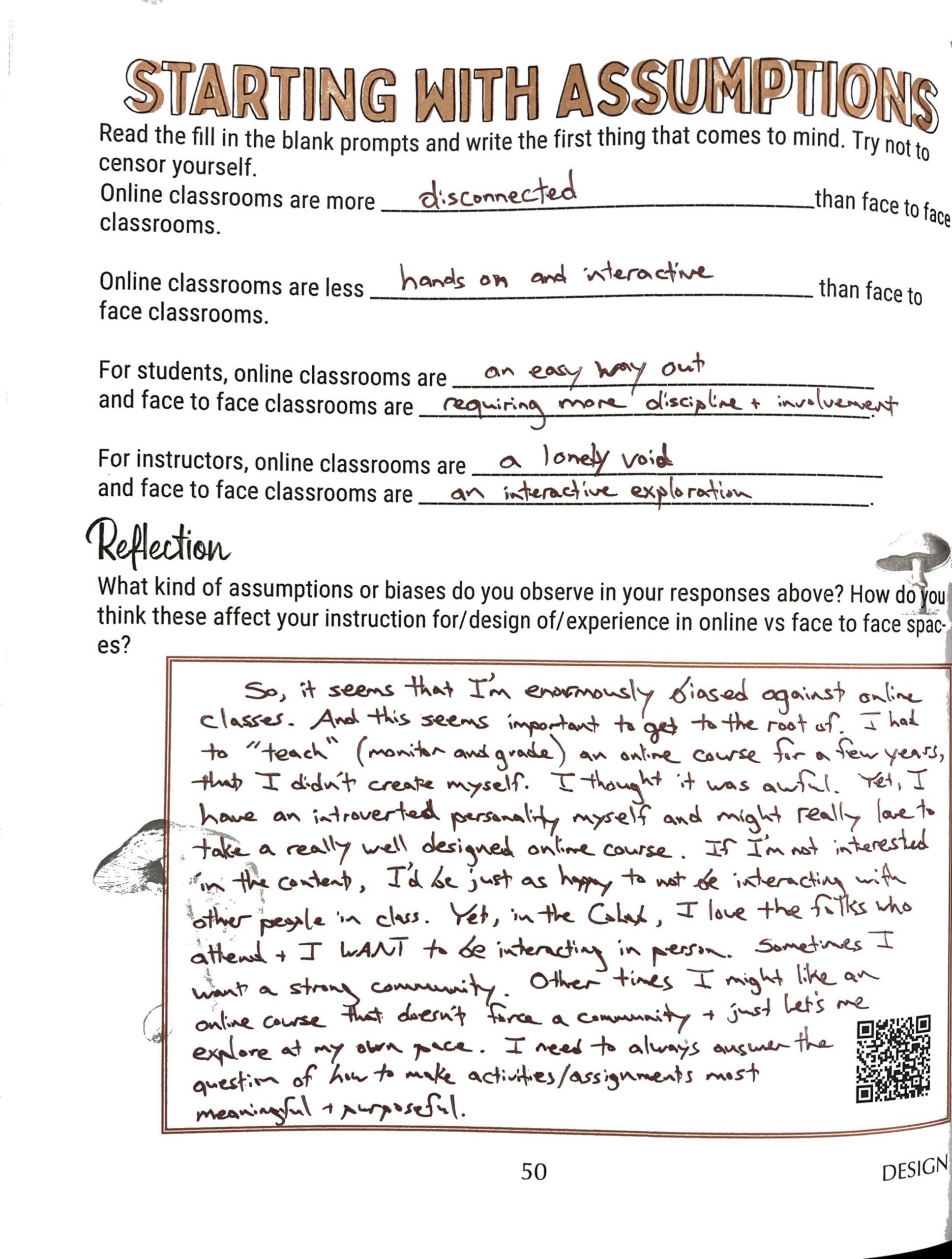 Examine any of your existing biases about face-to-face vs online teaching. What are you bringing to this work that may be impacting your ability to think creatively about teaching in different modalities?