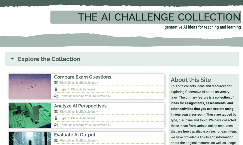 Welcome to The AI Challenge, a self-paced Design Forward module created to build faculty capacity with generative artificial intelligence (GENAI). Use the module menu above or the cards below to navigate the four topics; on each topic page you will find related resources, questions, and activities.