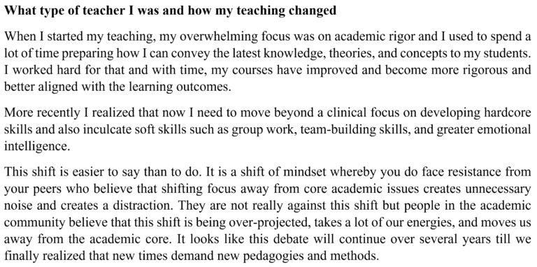 When I started my teaching, my overwhelming focus was on academic rigor and I used to spend a lot of time preparing how I can convey the latest knowledge, theories, and concepts to my students. I worked hard for that and with time, my courses have improved and become more rigorous and better aligned with the learning outcomes.
