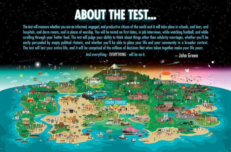 I have this poster in my office. It is a quote from John Green in the early days of Crash Course World History. It reads ““Yeah, about the test… The test will measure whether you are an informed, engaged, and productive citizen of the world, and it will take place in schools and bars and hospitals and dorm rooms and in places of worship. You will be tested on first dates, in job interviews, while watching football, and while scrolling through your Twitter feed. The test will judge your ability to think about things other than celebrity marriages, whether you’ll be easily persuaded by empty political rhetoric, and whether you’ll be able to place your life and your community in a broader context. The test will last your entire life, and it will be comprised of the millions of decisions that, when taken together, will make your life yours. And everything, everything, will be on it.”