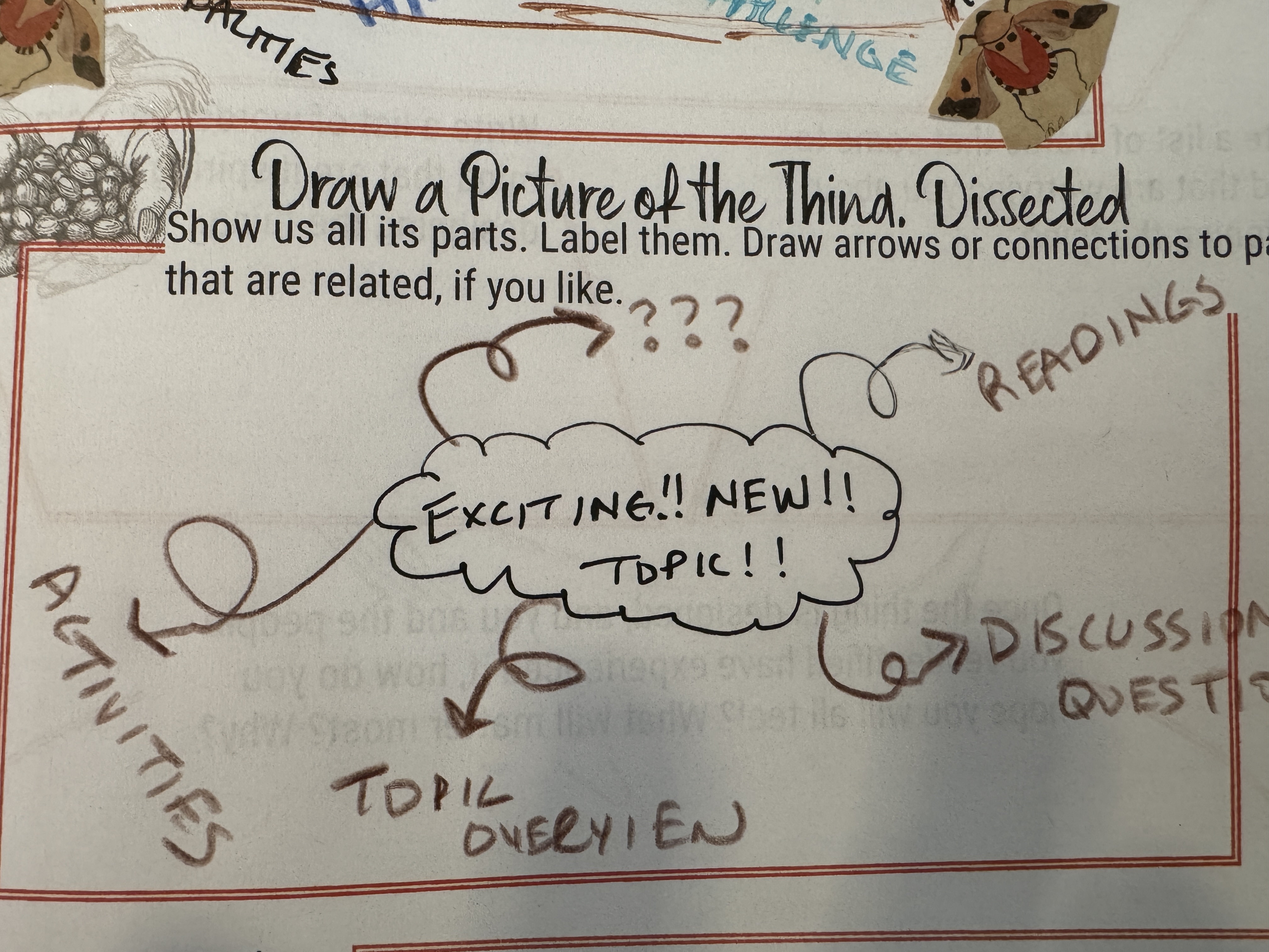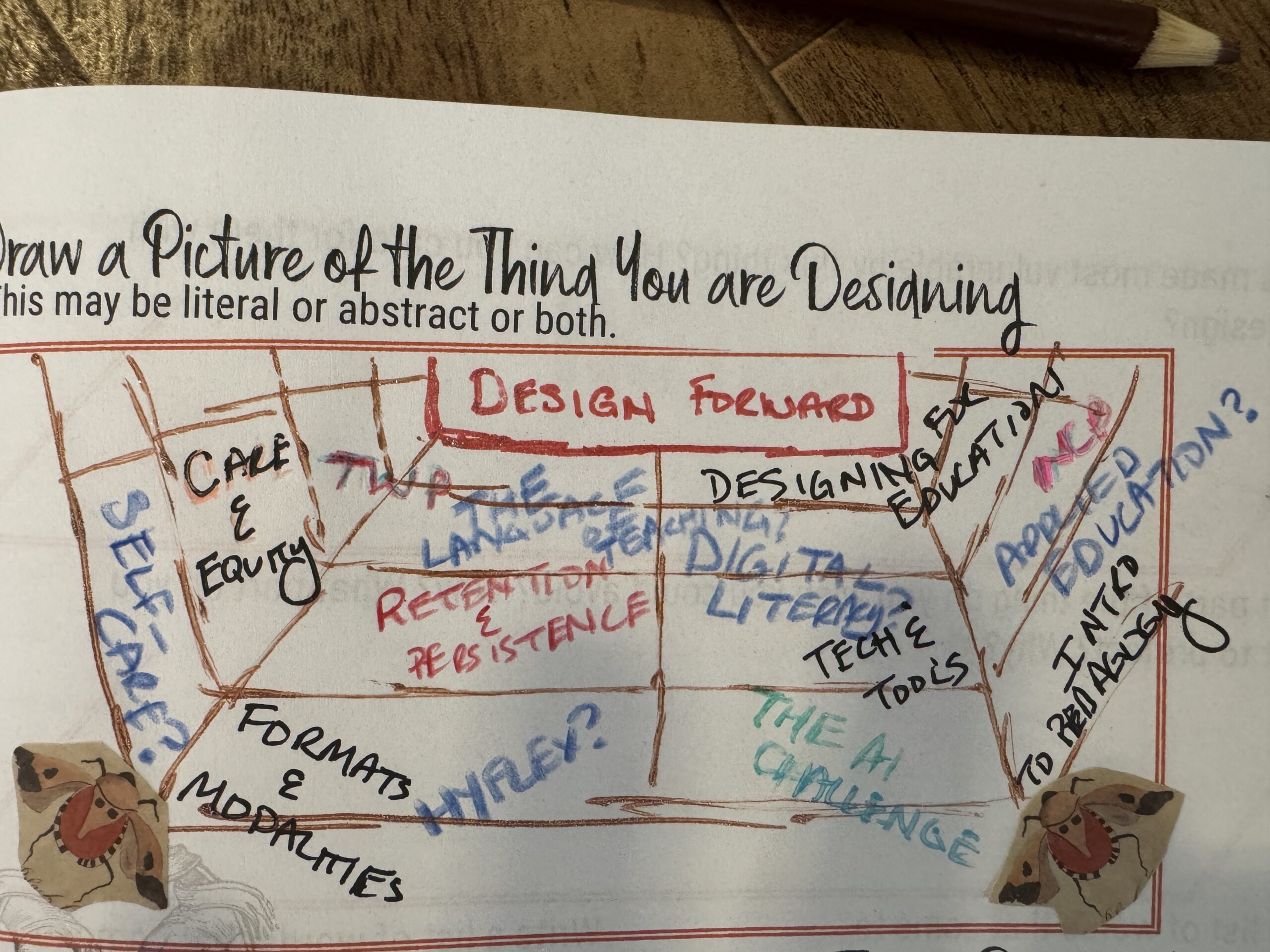 I’ll extend the metaphor I used in my first drawing and compare DF to a spider web, but the web of a really kind, non-carnivorous spider! This web is about building connection and bringing ideas together. In my drawing I “hung” our core modules and flexible modules on the web, but I also tried to brainstorm a few other topics based on what’s come up so far in Designing Forward this summer. These are just ideas, of course! I would want whatever topics people explore in their own topic to come from their own insights, discoveries, or interests.