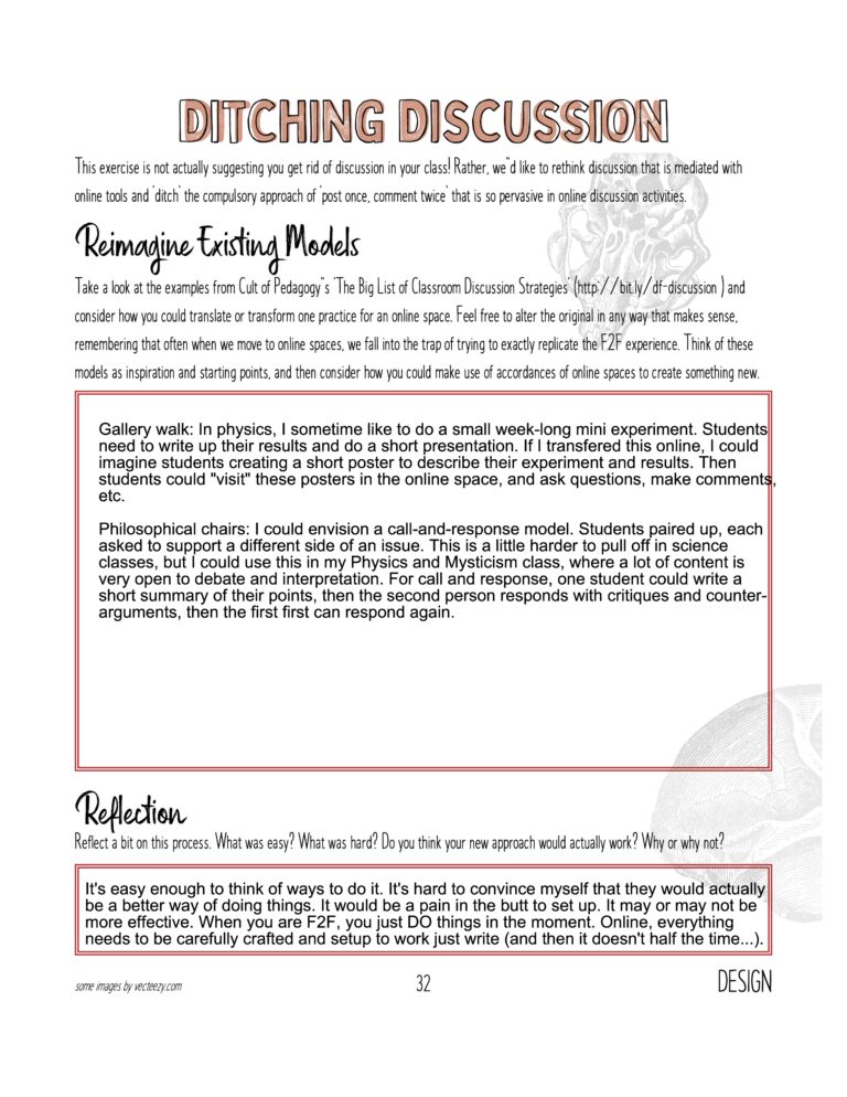 This was a really interesting exercise — take these F2F techniques, which I already don’t use often or that I don’t always feel I use effectively, and try to transfer them to the online space. Yikes! On the one hand, it was actually easier than I anticipated. I found that I could come up with ways to do it. Do I think they would be successful? I’m not sure. Do I think they would be easy to setup and coordinate? Absolutely not! I know for sure that I would feel annoyed having to setup the online spaces to make it work.