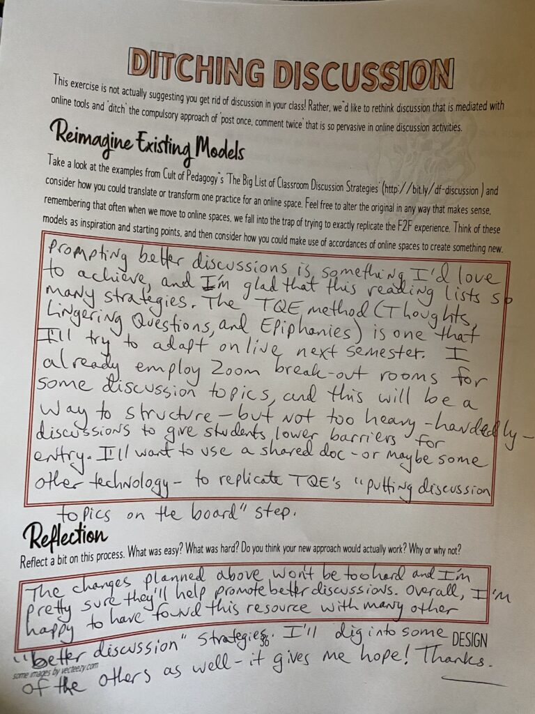 There’s a lot more on the workbook that I’d like to explore, but this topic really jumped out at me. I am motivated to making my online discussions more interactive and valuable and I am glad to see lots of thoughtful literature on the topic. It’s obviously a common concern!