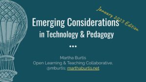 Wondering what’s going on with Musk’s Twitter and what you should know about it? Concerned about the latest AI tools that everyone is talking about and what they mean for your students? Thinking you may want to jump into the waters of Plymouth Create and build digital fluency more organically into your courses? This one-hour CoLab session provided an overview of the latest technology news and trends that may impact your students and your pedagogy.